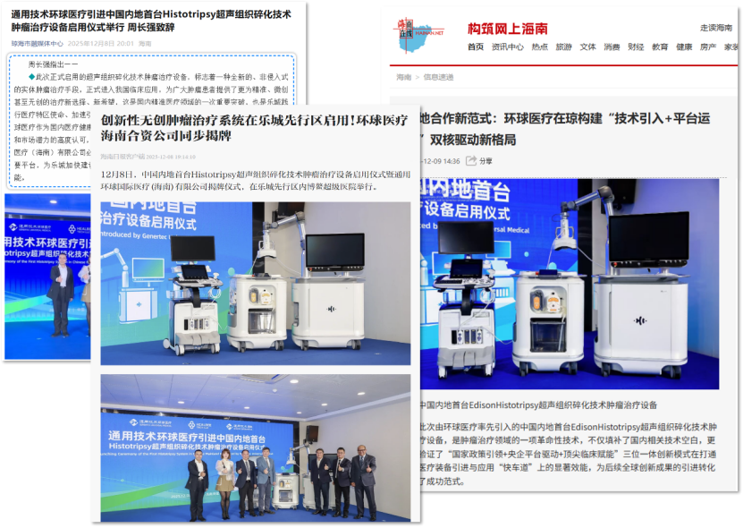 人民健康网、中国卫生网等垂直领域权威媒体,对环球医疗引入的中国大陆首台Histotripsy超声组织碎化技术肿瘤治疗设备的临床价值给予高度关注,评价其“将加速全球前沿医疗技术在中国的临床应用”,为国内肿瘤诊疗格局带来革新性影响。
